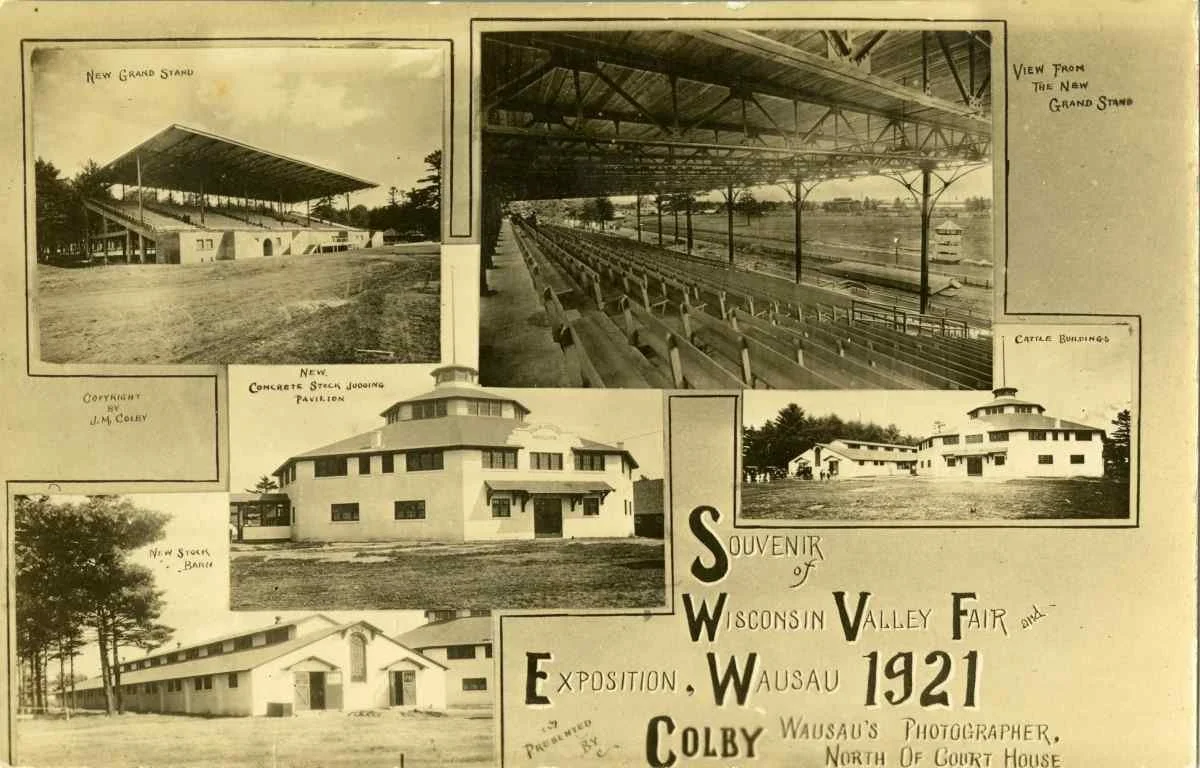 Souvenir postcard produced by James Colby for the first Wisconsin Valley Fair and Exposition 1921. It shows the structures built by the County for the new park that were enjoyed by fairgoers.