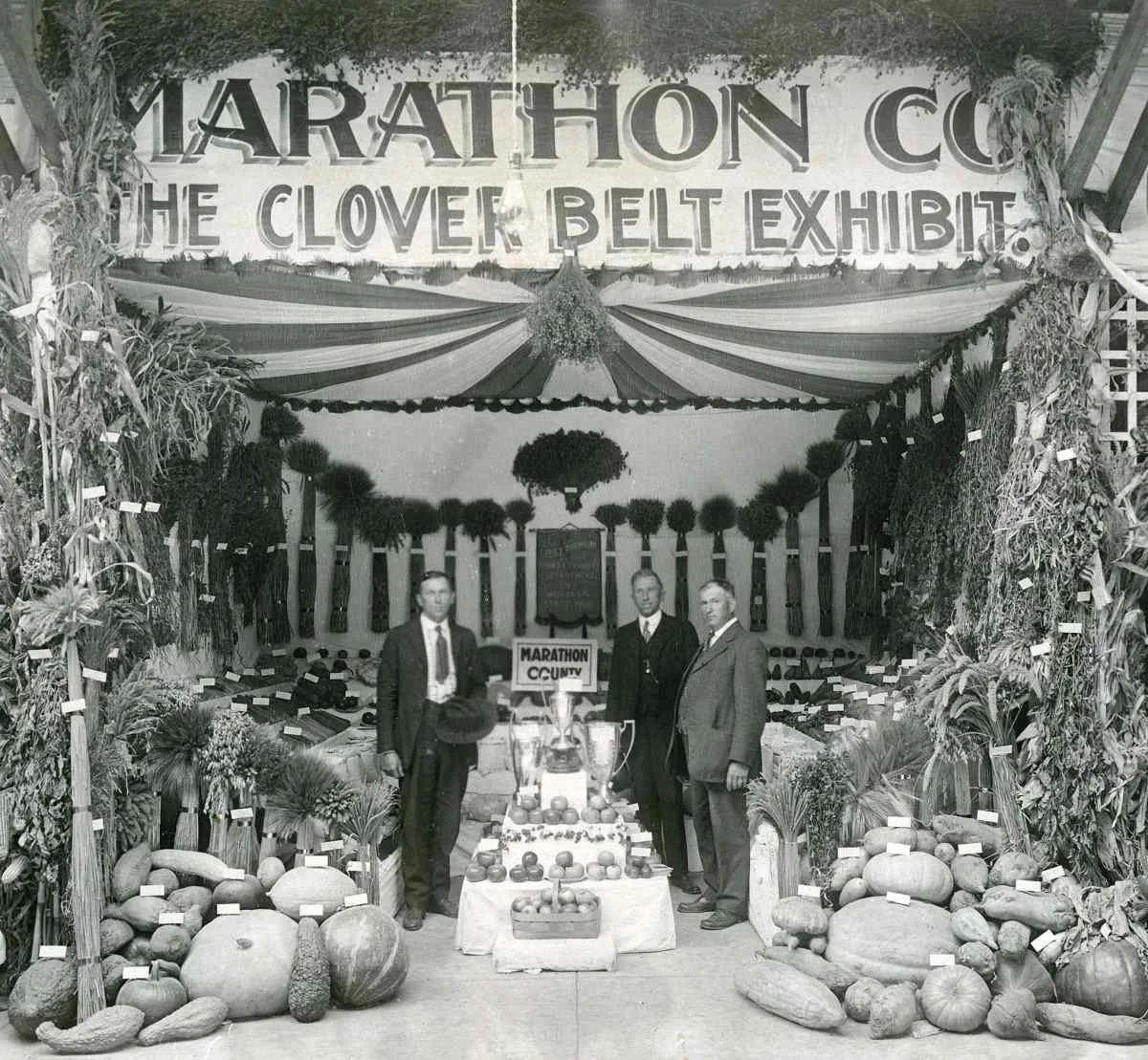 The Marathon County delegates to the 1919 Wisconsin State Fair posing with their award-winning display.