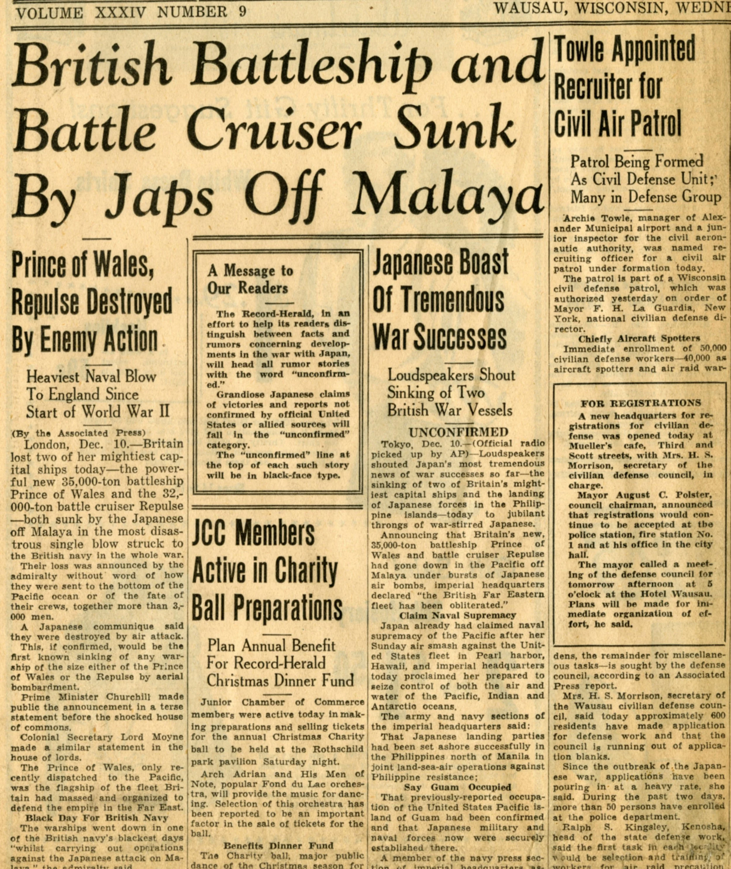 The front pages of the Wausau Daily Record Herald over the next few days continued to be dedicated to reporting whatever news was available, although there was not a great deal of good news--it gradually became clear that the attack at Hawaii was part of a much wider Japanese offensive against American and Allied territory across the Pacific--and the Record-Herald was hesitant to reprint false information.