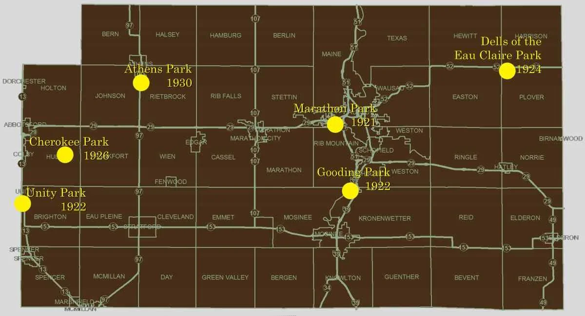 A map of Marathon County showing the location of the first six County Parks
