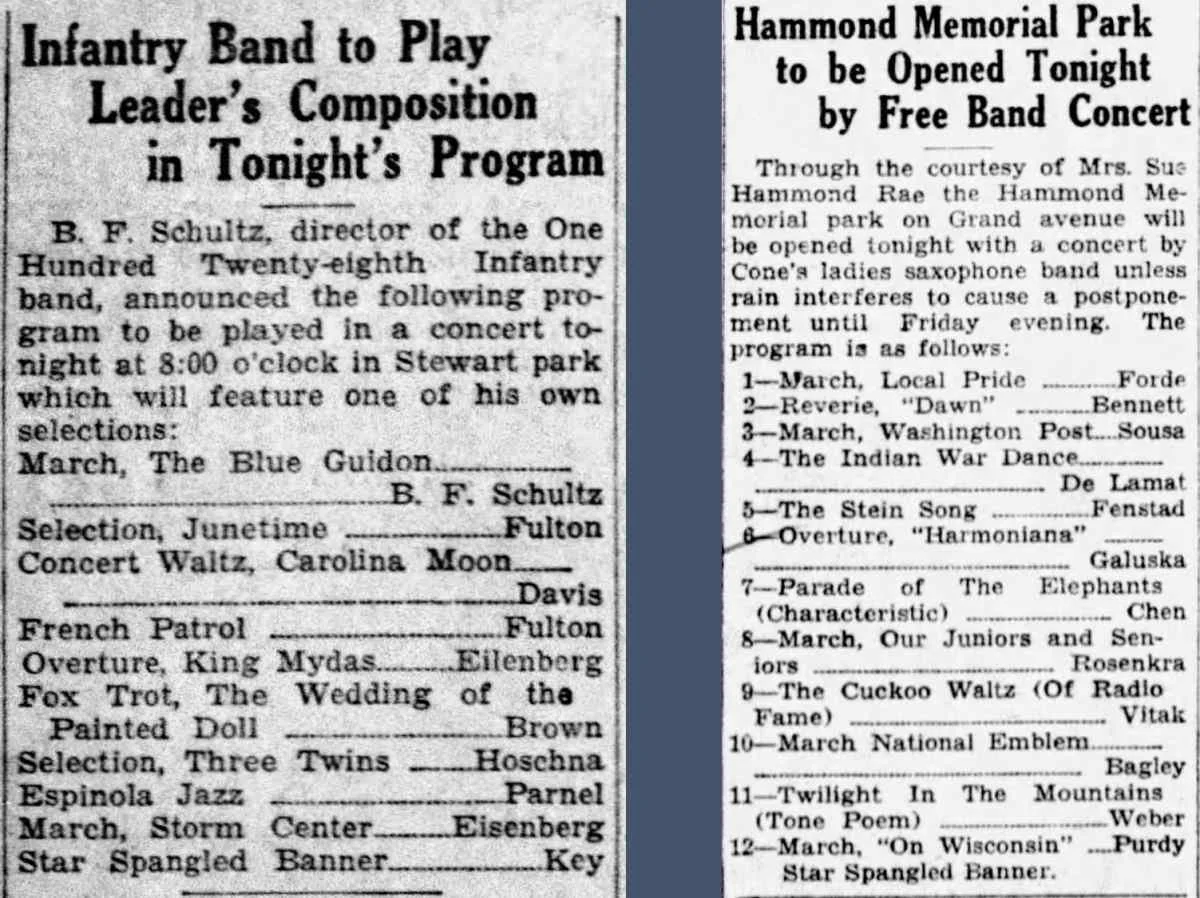 Articles giving the repertoire for concerts to be played by the 128th Infantry Band in 1929 (left) and the Ladies Saxophone Band (1930). This shows that the Ladies Saxophone Band played much the same repertoire as contemporary community bands, right down to the traditional closing with the Star Spangled Banner for a guaranteed standing ovation.